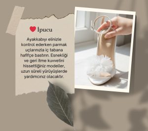 Seçtiğiniz ayakkabı ne kadar konforlu olursa olsun düğün gününden önce dikkat edilmesi gereken birkaç pratik adım bulunuyor. Ayakkabıları teslim aldıktan sonra evde temiz bir zeminde kısa süreli yürüyüşler yapmak malzemenin ayağınızın yapısına alışmasını kolaylaştırır. Ayrıca satın alma işlemini ayakların gün boyu hafifçe genleştiği öğleden sonra saatlerinde yapmak en doğru numara seçimini yapmanıza yardımcı olur.